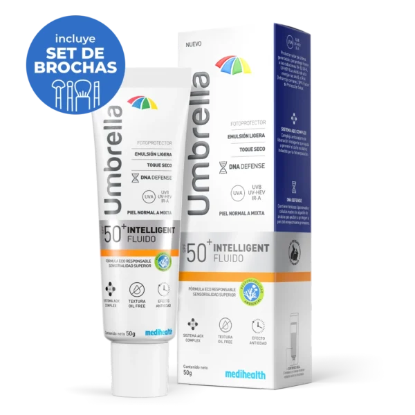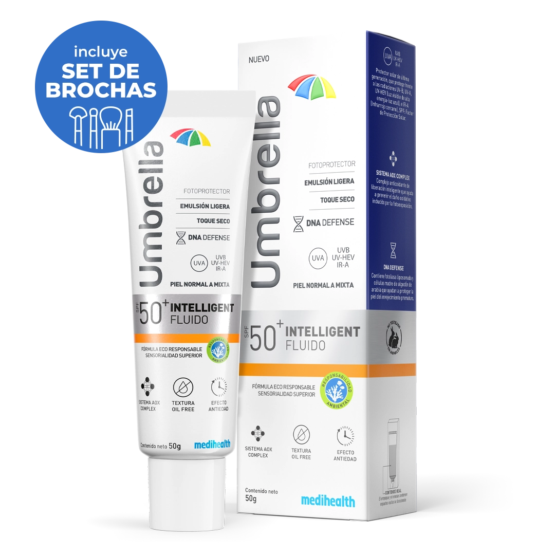 Umbrella Intelligent Fluido fotoprotector con sistema integral de cuidado dermatológico que potencia los mecanismos de prevención y reestructuración de la piel frente a los daños causados por la radiación solar, combinando los avances de la nanotecnología, biotecnología y liberación inteligente de moléculas dermatológicamente activas.