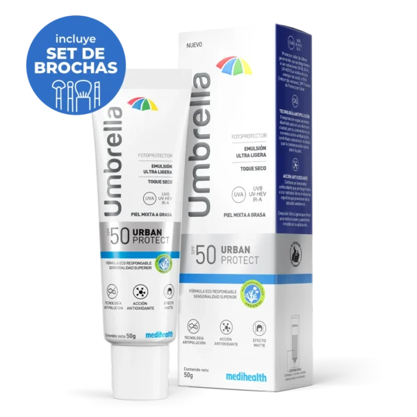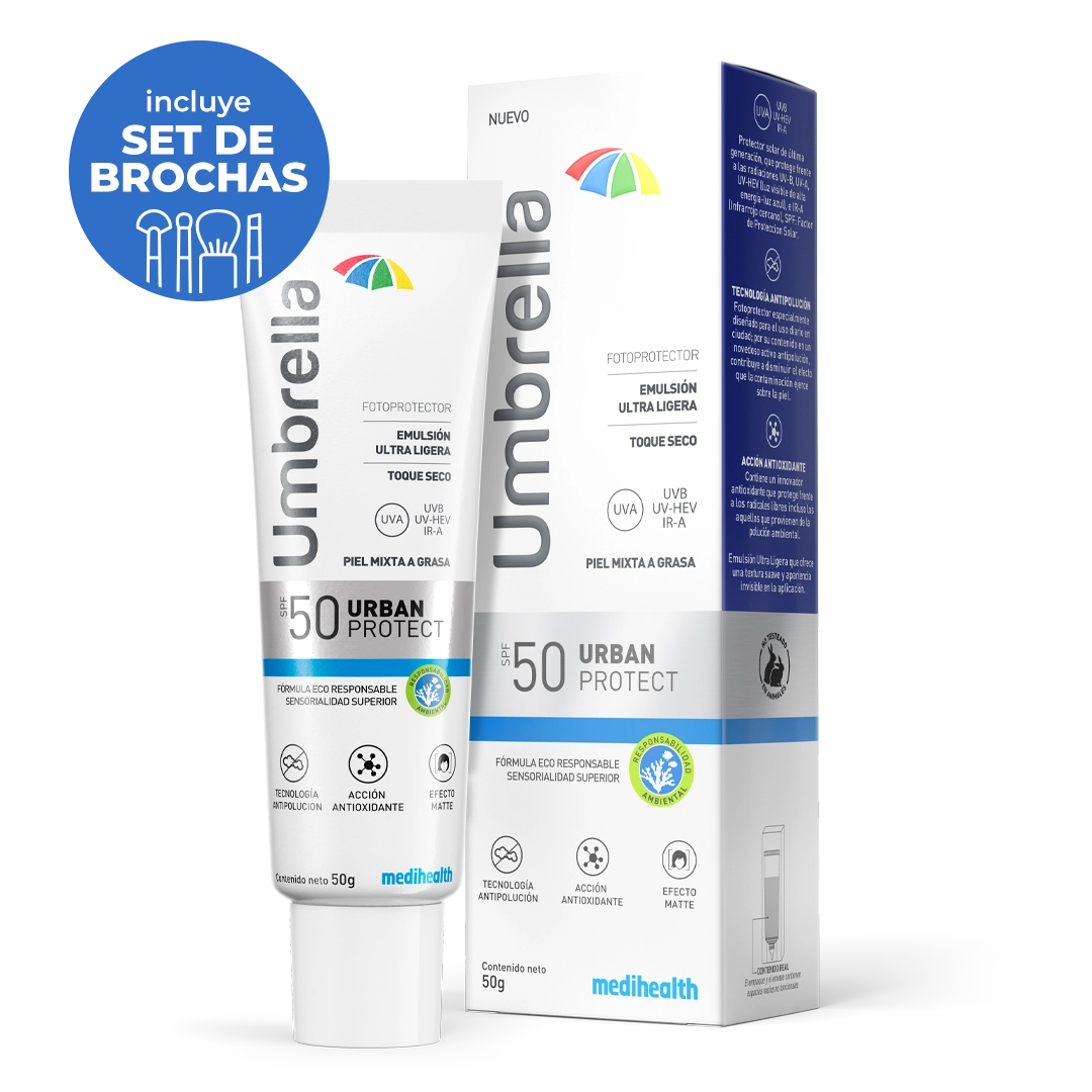 Umbrella Urban fotoprotector en emulsión ultraligera que previene la aparición de arrugas y manchas. Purifica la piel del estrés oxidativo celular. Hidrata la piel con vitamina E. Suaviza el aspecto de la piel y la prepara para el maquillaje.